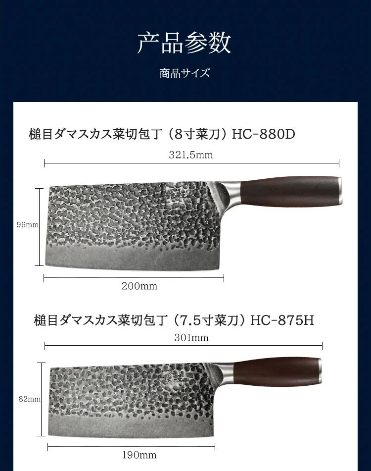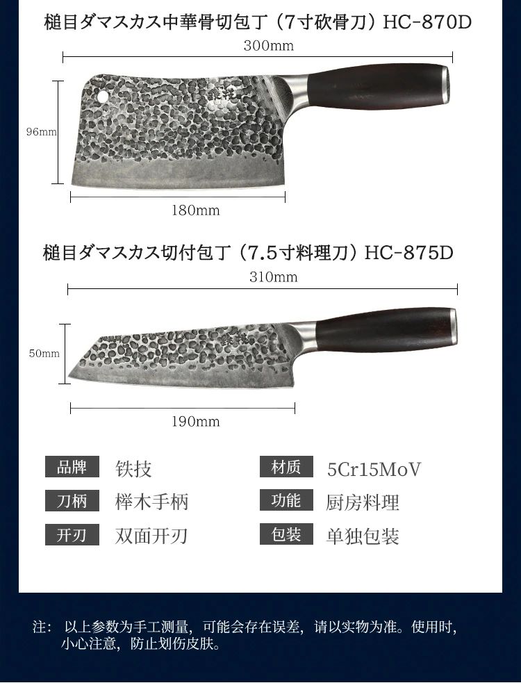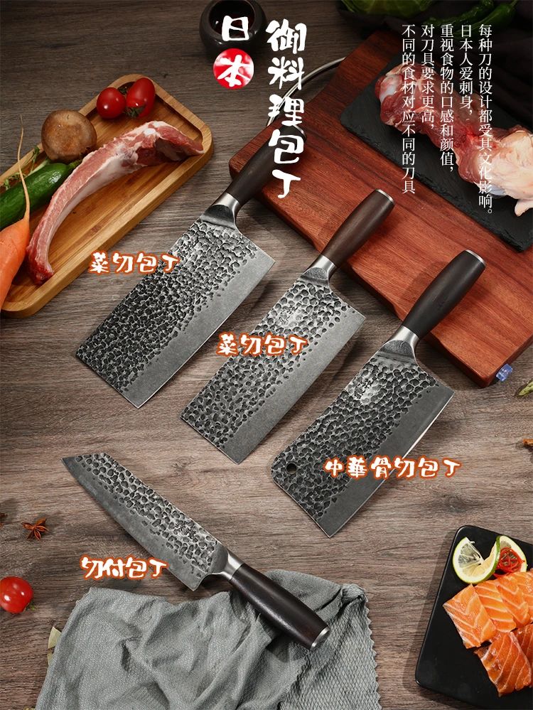 產(chǎn)品參數(shù):8寸菜刀、7.5寸料理刀、7寸砍骨刀、7.5寸菜刀