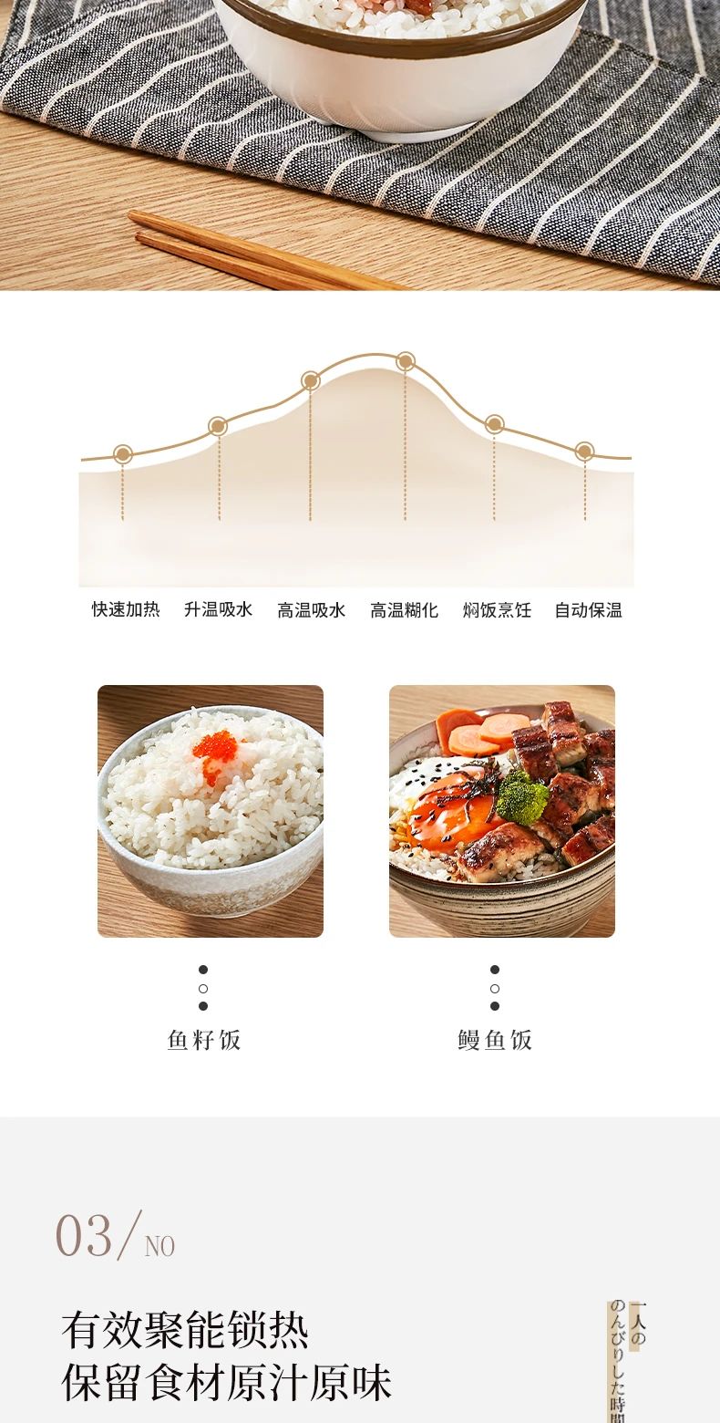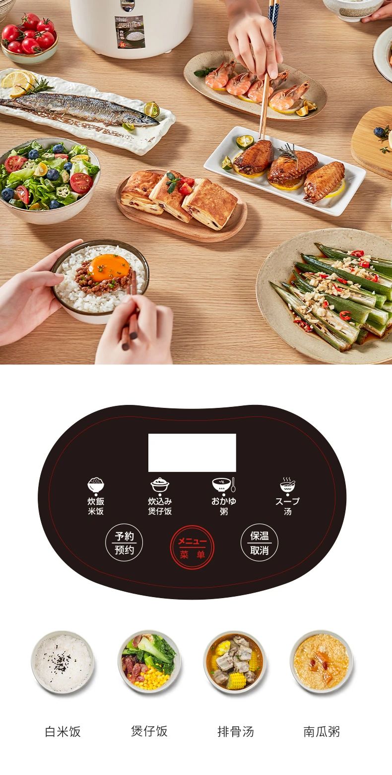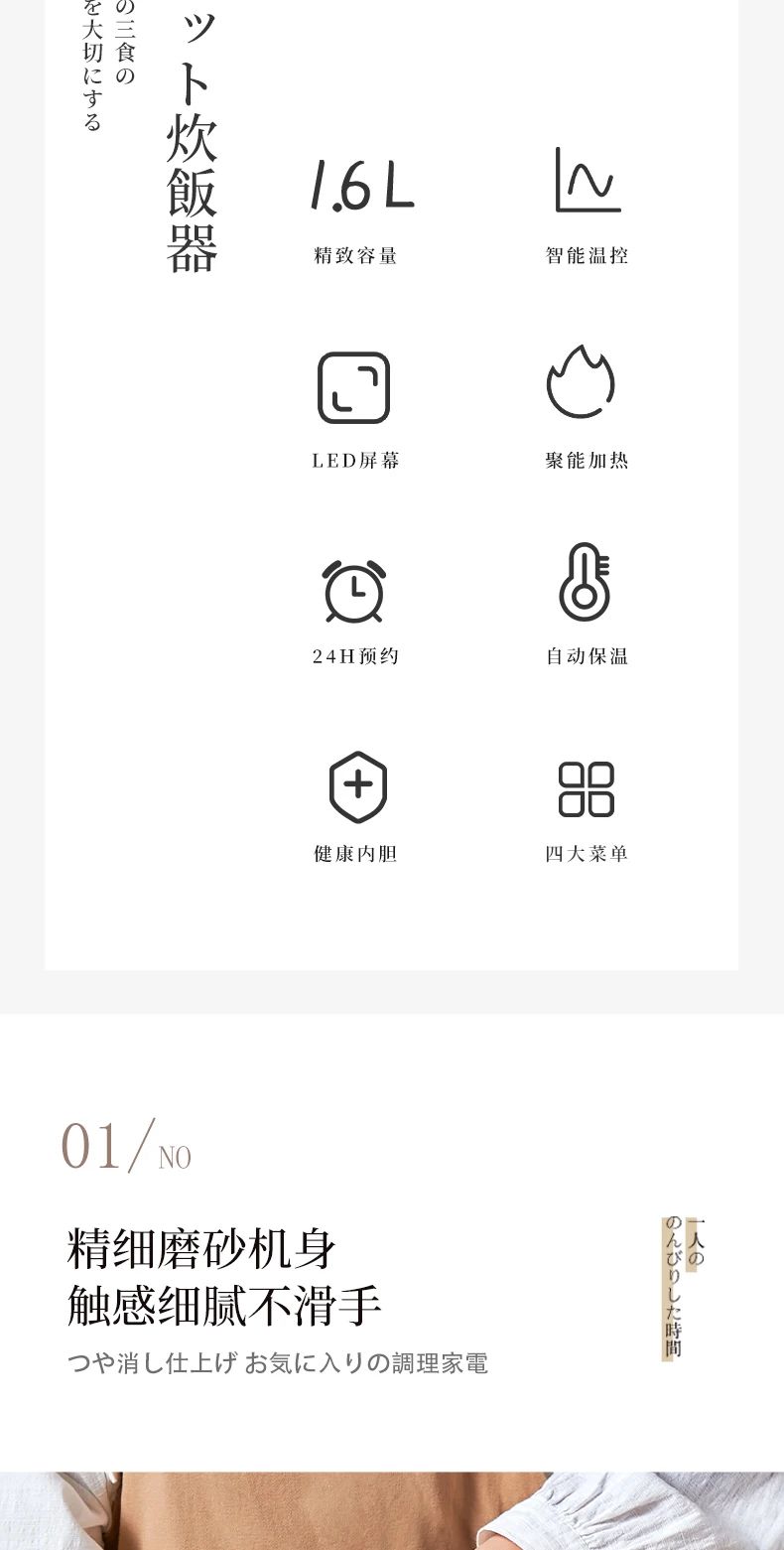 小巧的機身,且重量較輕,1.6L的容量足以滿足兩個人的日常使用需求,滿滿當當可以煮約3杯米量,除了煮白米飯,它還可以用來煲湯、煮粥等,一個電飯煲該有的它都有!尤其值得一提的就是4大快捷菜單(雖小但應有盡有),米飯、粥、湯以及煲仔飯,輕松滿足日常烹飪需求,采用微電腦控制面板一鍵烹煮,家中的老人也可以輕松操作。還有貼心的預約保溫功能!24小時智能預約,12小時長效保溫,讓你早餐有熱粥,下班有暖湯。