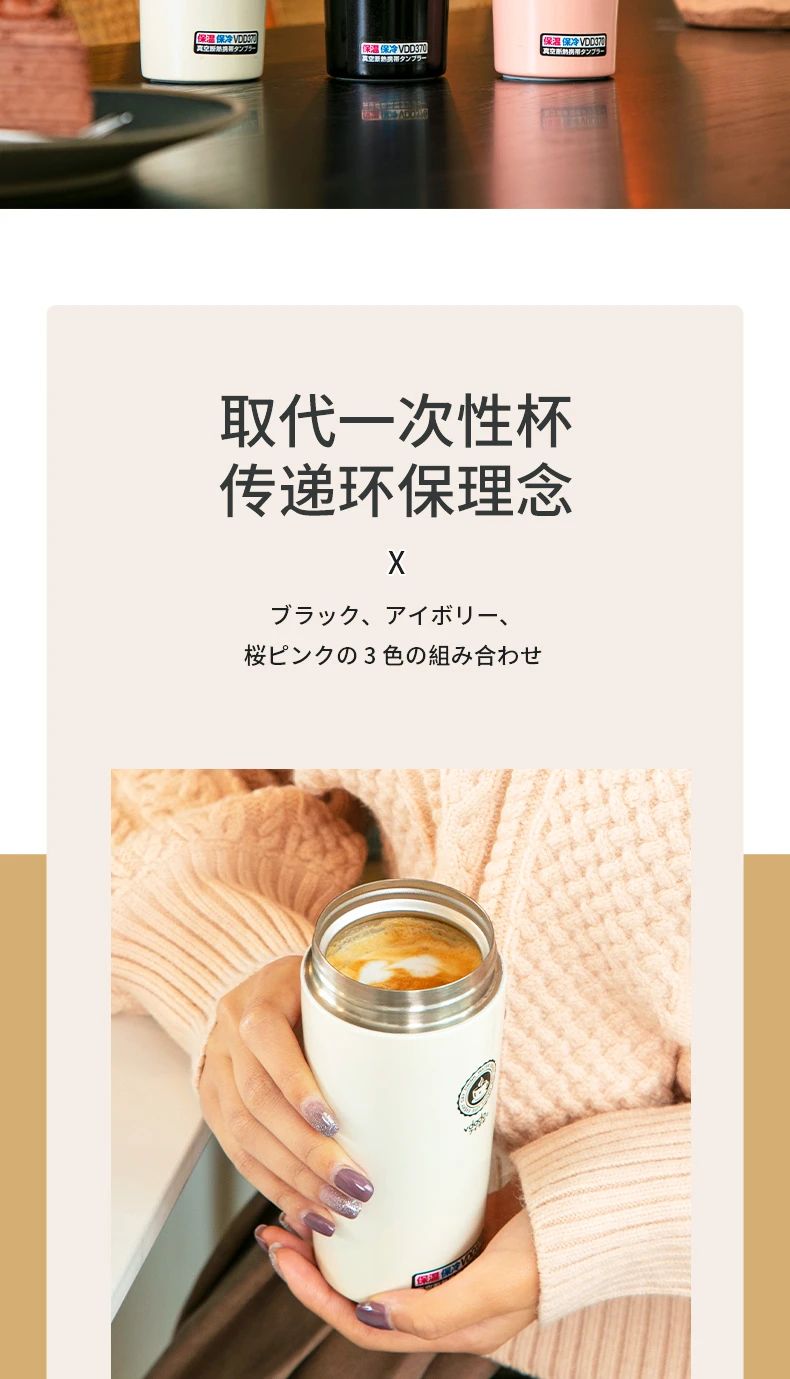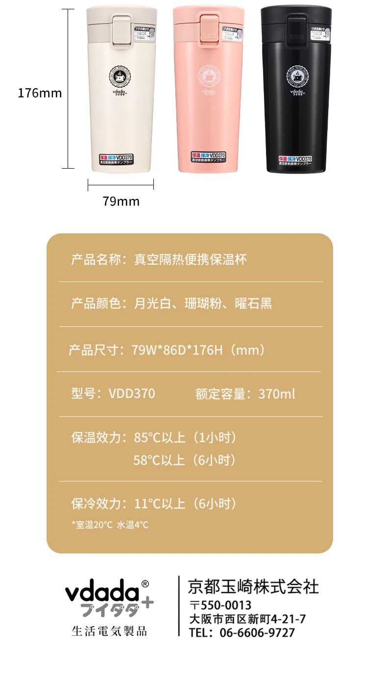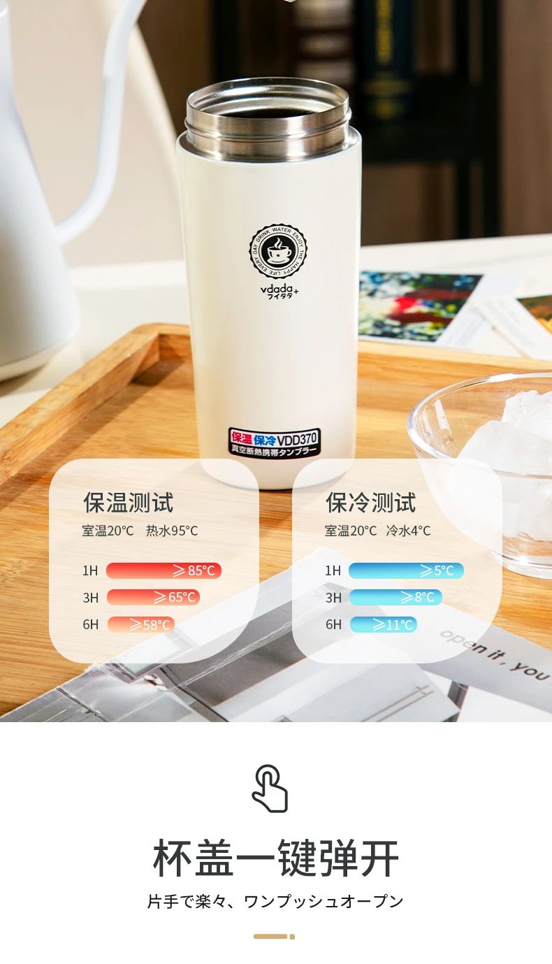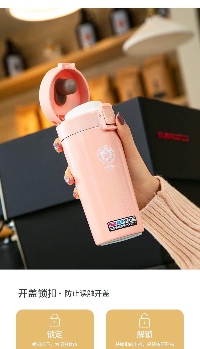 日本vdada真空隔熱便攜保溫杯,極簡(jiǎn)設(shè)計(jì),搭配耀石黑、月光白、珊瑚粉三色,呈現(xiàn)純凈美感,取代一次性杯,傳遞環(huán)保理念,370ml的容量不會(huì)占用太多空間,小巧又不失設(shè)計(jì)感,口設(shè)計(jì)符合嘴部曲線設(shè)計(jì)飲水更加流暢解鎖咖啡雙飲模式,可以小口慢品,也可以大口暢飲,滿(mǎn)足不同飲用習(xí)慣一杯多用,大家可以根據(jù)自己的喜好選擇飲品,水、咖啡、果汁、茶飲均可,出門(mén)前一杯冰咖,等天氣再冷些就可以沖泡一些熱飲,304不銹鋼的材質(zhì),采用五層鎖溫工藝使保溫杯起到雙重保暖保涼的作用