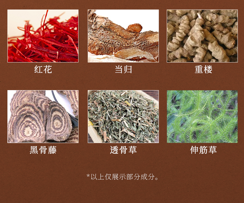 【主要成分】艾草、黑老虎、三七、紅花、浙 妥歸、重樓、黑骨藤、透骨草、筋草、乳香、沒藥、穿破石、金錢草、雞血藤、川牛膝、見血飛、甘油、凡士林等