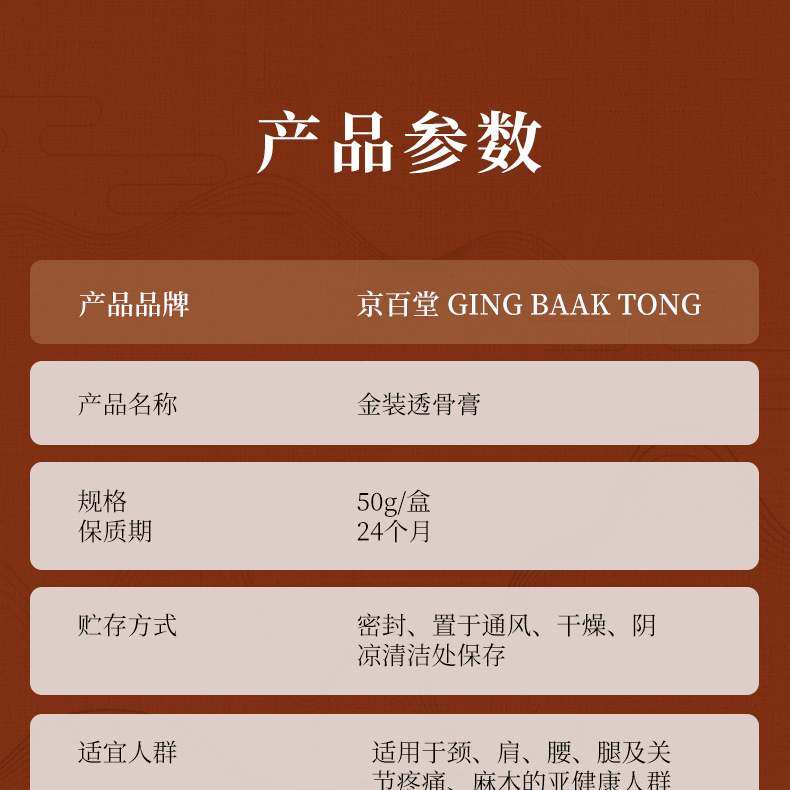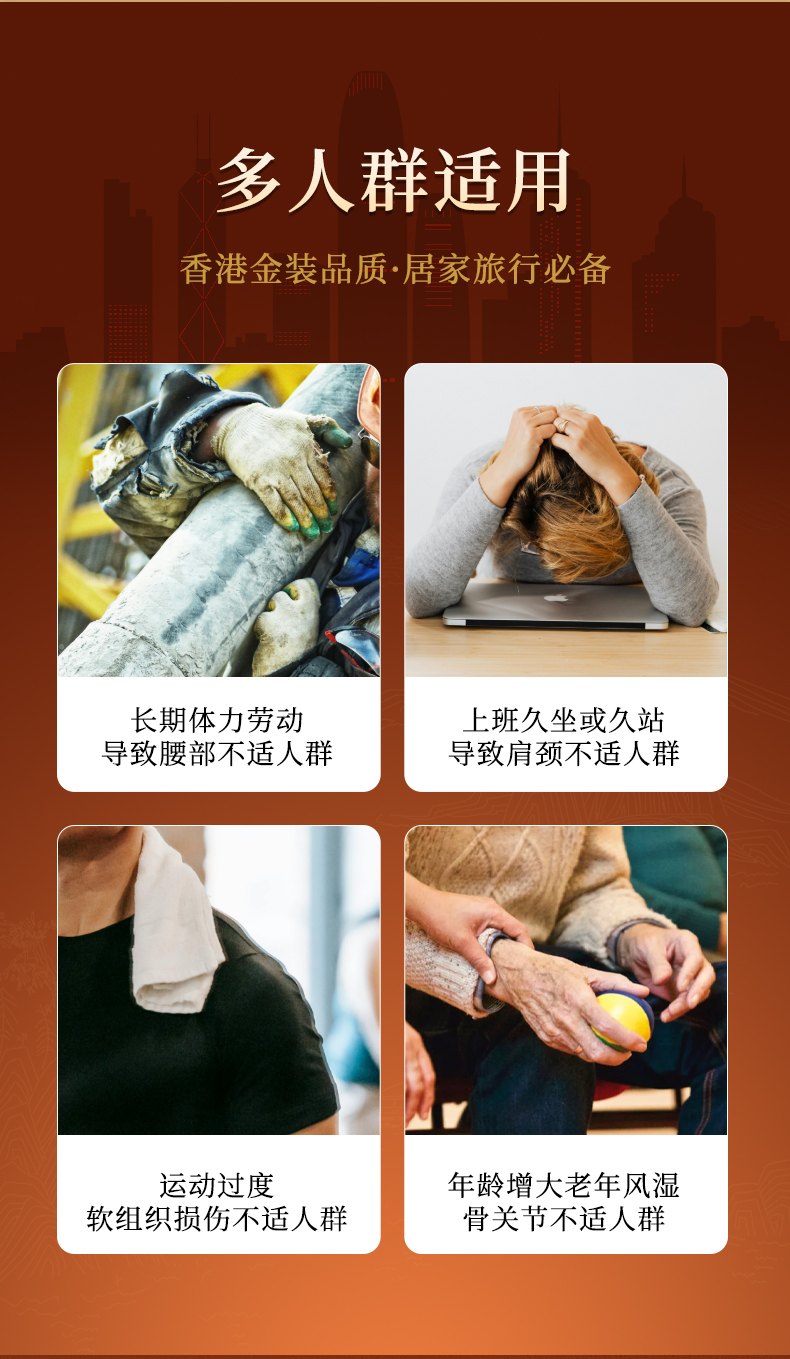 長(zhǎng)期體力勞動(dòng)導(dǎo)致腰部不適人群,上班久坐或久站導(dǎo)致肩頸不適人群,運(yùn)動(dòng)過度軟組織損傷不適人群,年齡增大老年風(fēng)濕骨關(guān)節(jié)不適人群統(tǒng)統(tǒng)都可以適用香港京百堂透骨膏!香港金裝品質(zhì),居家旅行必備
