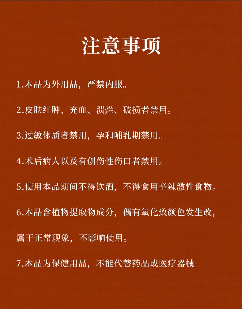 【注意事項(xiàng)】1.本品為外用品,嚴(yán)禁內(nèi)服。2.皮膚紅腫、充血、潰爛、破損者禁用。3.過敏體質(zhì)者禁用,孕和哺乳期禁用。4.術(shù)后病人以及有創(chuàng)傷性傷口者禁用。5.使用本品期間不得飲酒,不得食用辛辣激性食物。6.本品含植物提取物成分,偶有氧化致顏色發(fā)生改,屬于正?,F(xiàn)象,不影響使用。7.本品為保健用品,不能代替藥品或醫(yī)療器械。
