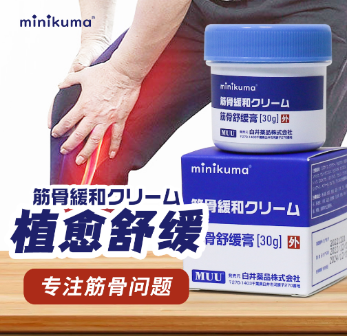 minikuma筋骨舒緩膏【品牌】MINIKUMA【品名】MUU 筋骨舒緩膏【規(guī)格】30g【產(chǎn)地】中國【適用人群】全家適用(嬰幼兒、過敏體質者、孕婦、哺乳期女性請勿使用)【使用方法】取適量膏體涂抹于不適處每日3-5回【成分】徐長卿、紅花、羌活、艾葉、川營、三七、穿破石、黑老虎、川椒、白芷、透骨草、凡士林、甘油、冰片、薄荷腦、樟腦、氮酮等為主要原料?!举u點】1.高效率保存萃取的植物成分,能夠有效地緩