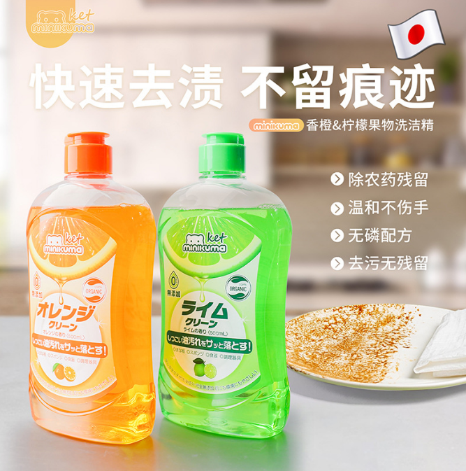 minikuma ket洗潔精【品牌】minikuma【香型】檸檬味、香橙味【規(guī)格】500ml【產(chǎn)地】日本【用途】清洗廚具餐具,去除油污洗凈果物污漬殘留【注意】請存放于嬰幼兒接觸不到的地方,如有誤飲用,請立即喝水稀釋并及時就診。【產(chǎn)品的賣點】1.成分溫和 100%的食品類原料 除清潔平常的餐具 廚具外還可用于清潔母嬰用品和蔬菜水果2.清潔能力強 能高效去油污 泡沫細(xì)膩 用了不傷手 容易清洗不殘留污
