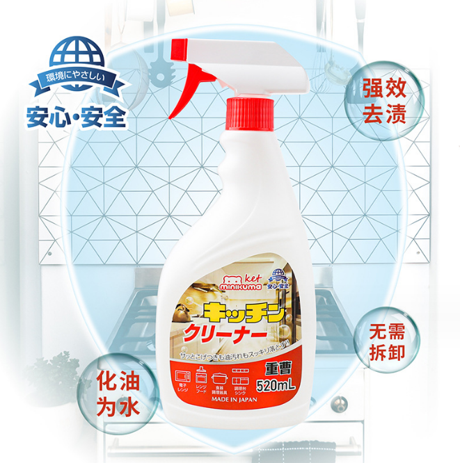 minikuma ket廚房去油污噴劑 【品牌】minikuma【規(guī)格】520ml【產(chǎn)地】日本【用途】去除廚房/廚具厚重油污【注意】請置于陰涼處及兒童不易接觸之地,若誤食請立即就醫(yī),若不慎入眼,請立即用大量清水清洗,并及時就醫(yī)?!举u點】1.這款清潔劑刺鼻的味道很淡,雙向噴頭滿足不同需求,揭開開關(guān),泡沫與噴霧模式隨意切換,也可以不用戴手套,使用完后沖洗手也不會有那種黏黏的感覺。2.不含添加劑,不腐蝕