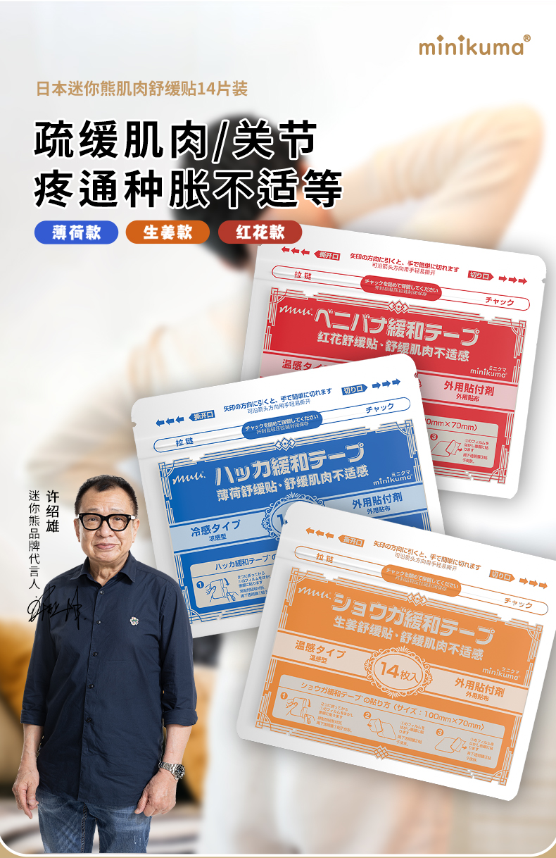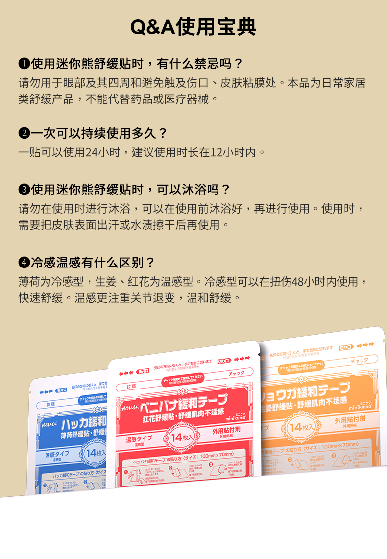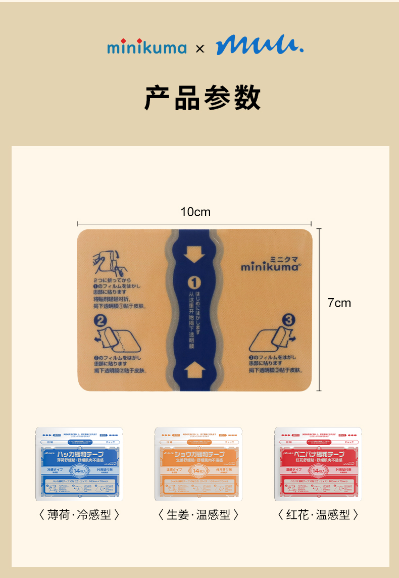 根據(jù)不同酸痛問題,minikuma肌肉舒緩貼定制了冷、熱、溫三款,一次性滿足多種需求!