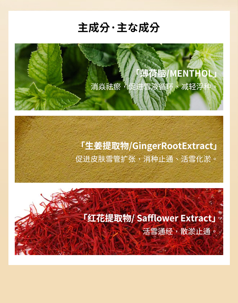 紅花款:紅花提取物、三七提取物、羌活提取物、穿破石提取物、肉桂提取物、徐長卿提取物、透骨草提取物、冰片、樟腦、紅花油、氮酮等為主要原料。