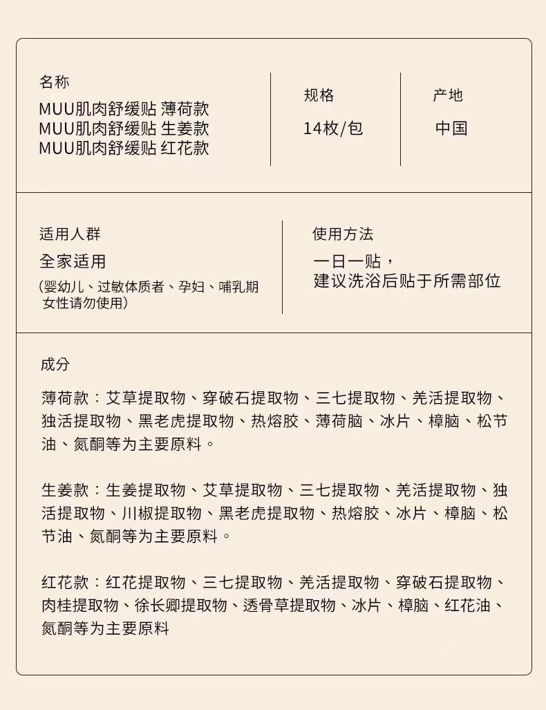 薄荷款:艾草提取物、穿破石提取物、三七提取物、羌活提取物、獨活提取物、黑老虎提取物、熱熔膠、薄荷腦、冰片、樟腦、松節(jié)油、氮酮等為主要原料。