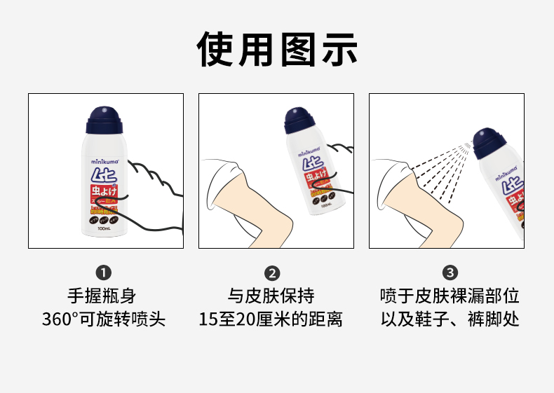 使用方法:噴于皮膚裸露部位以及衣服、鞋子、褲腳處