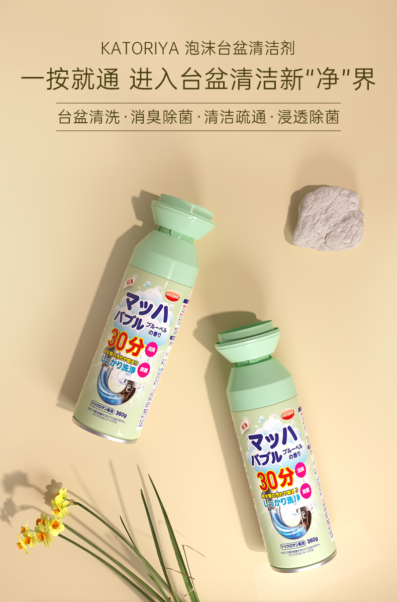 KATORIYA洗面臺用合成洗劑【品牌】KATORIYA【品名】 洗面臺用合成洗劑【成分】表面活性劑、溶解劑、除菌劑等【規(guī)格】360g/瓶【使用方法】1.上下?lián)u動10下,旋轉(zhuǎn)噴嘴,箭頭對準(zhǔn)“open”解鎖2.將噴嘴垂直對準(zhǔn)排水口3.向下按壓,噴出泡沫后,將臟污、堵塞物排出,噴嘴旋轉(zhuǎn)至“l(fā)ock”上鎖4.靜止約30分鐘,徹底清洗管道,除菌、排污、消臭【儲存】請保存于陰涼干燥處【產(chǎn)地】中國【保質(zhì)期】3