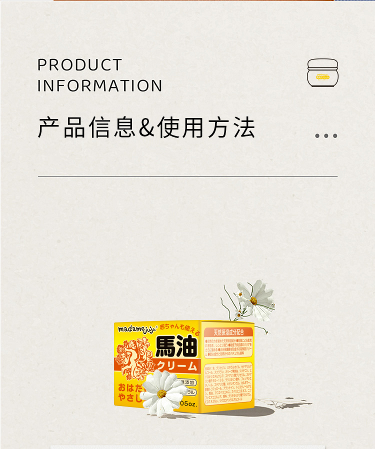 MADAMEJUJU馬油滋潤(rùn)霜【品牌】:MADAMEJUJU【品名】:MADAMEJUJU馬油滋潤(rùn)霜【產(chǎn)地】:中國(guó)【保質(zhì)期】:三年【適用人群】:任何人群及膚質(zhì)【容量】:30g【主要成分】:甘油、礦油、油橄欖果油、黃原膠、馬脂等【關(guān)于效期】:由于部分國(guó)家規(guī)定化妝品保質(zhì)期在3年上不要求標(biāo)注生產(chǎn)日期,所以部分產(chǎn)品包裝沒有標(biāo)明生產(chǎn)日期,僅有批號(hào)僅供查詢,介意者慎拍!【關(guān)于圖片與實(shí)物】:由于產(chǎn)品更新速度快,