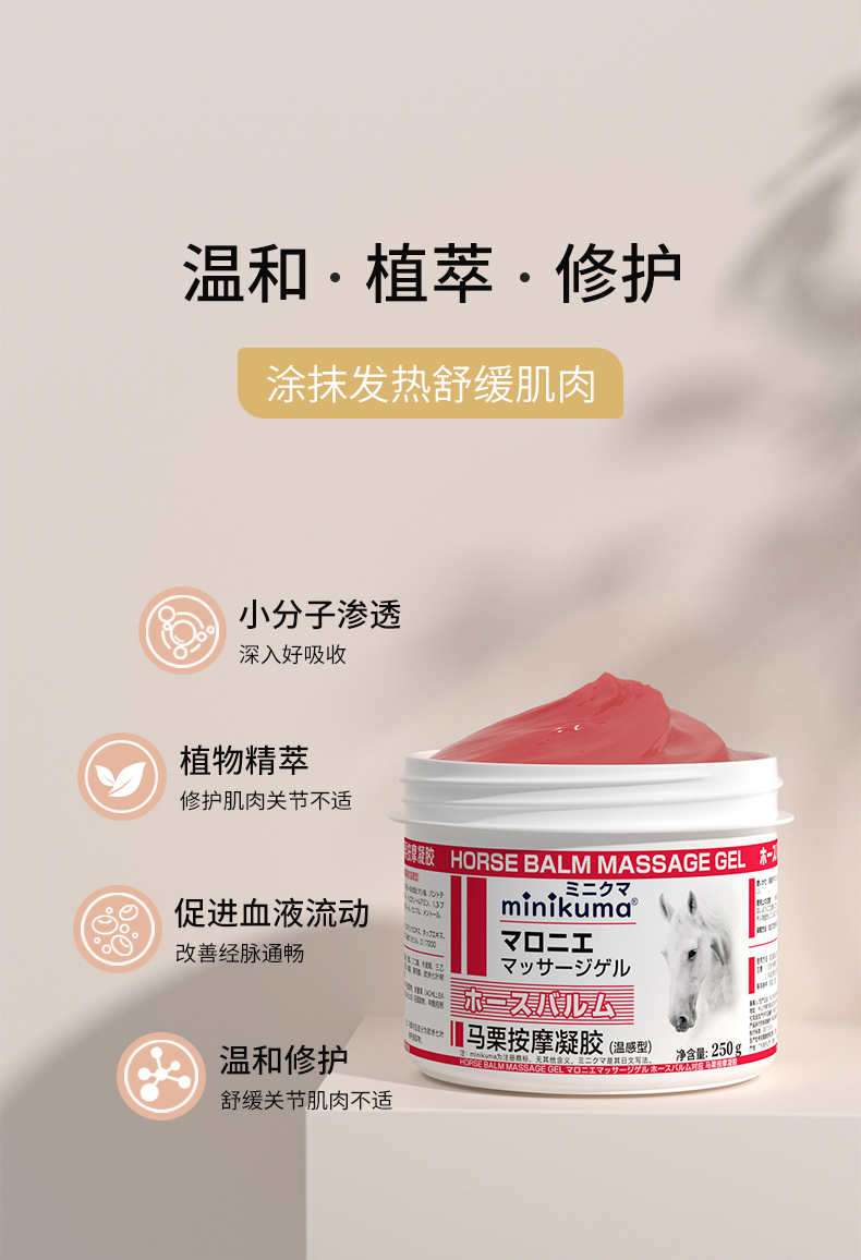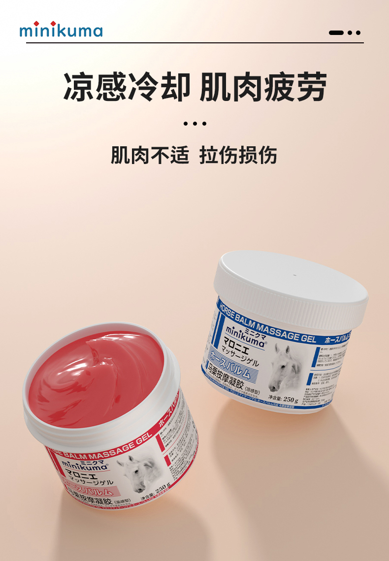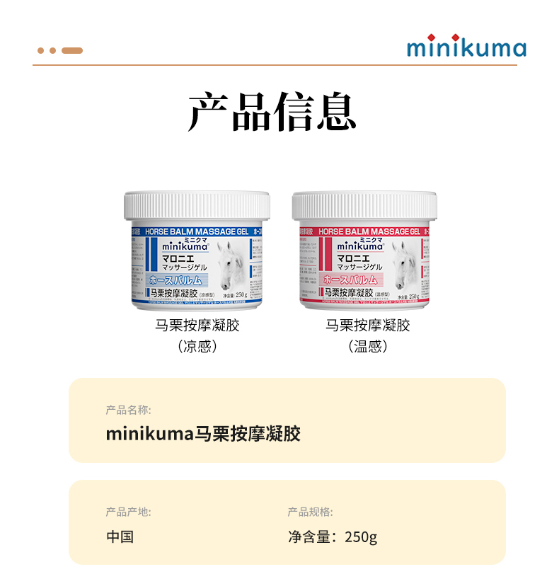 minikuma馬栗按摩凝膠【品牌】minikuma【品名】minikuma馬栗按摩凝膠【產(chǎn)地】中國【規(guī)格】250g【用法用量】取適量本品涂于肩頸腰腿部皮膚輕輕按摩【注意事項】1僅供外部使用,使用后請洗手避免接觸眼睛,避免兒童使用2本品含香蘭基丁基醚,用后有溫感,使用前請局部適用【產(chǎn)品成分】馬栗按摩凝膠(涼感):水、乙醇、PEG-40精華蓖麻油、丙二醇薄荷醇、卡波姆、丁二醇、三乙醇胺、1,3-丙二