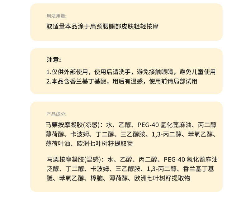 【用法用量】取適量本品涂于肩頸腰腿部皮膚輕輕按摩